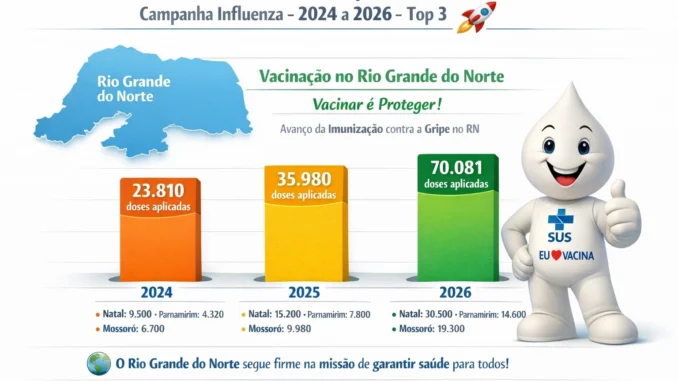 O Rio Grande do Norte registrou um resultado expressivo na campanha de vacinação contra a gripe. No Dia “D”, realizado no sábado (28), foram aplicadas 70.081 doses, número que representa praticamente o dobro do total registrado na mesma mobilização em 2025.